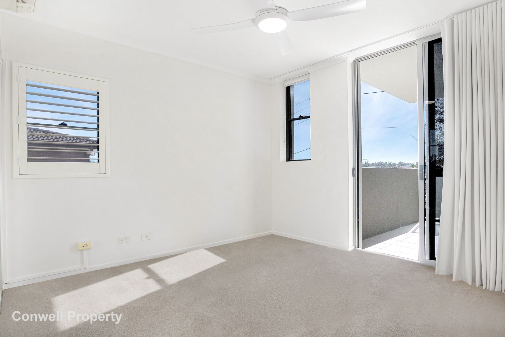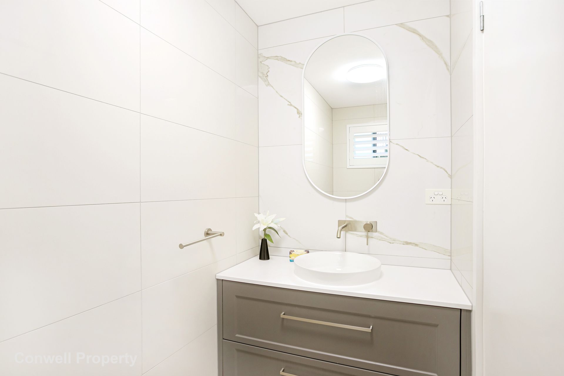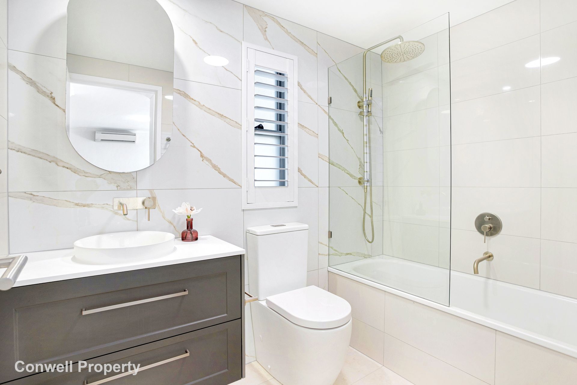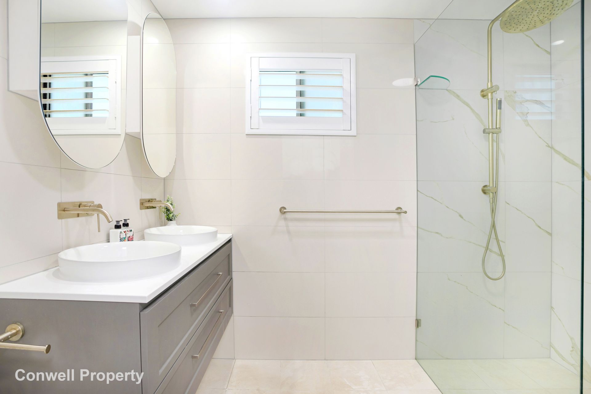 The master bedroom is complete with plenty of wardrobe space, and a fabulously renovated bathroom with double basins, and a huge walk-in shower – complete with plantation shutters and window.