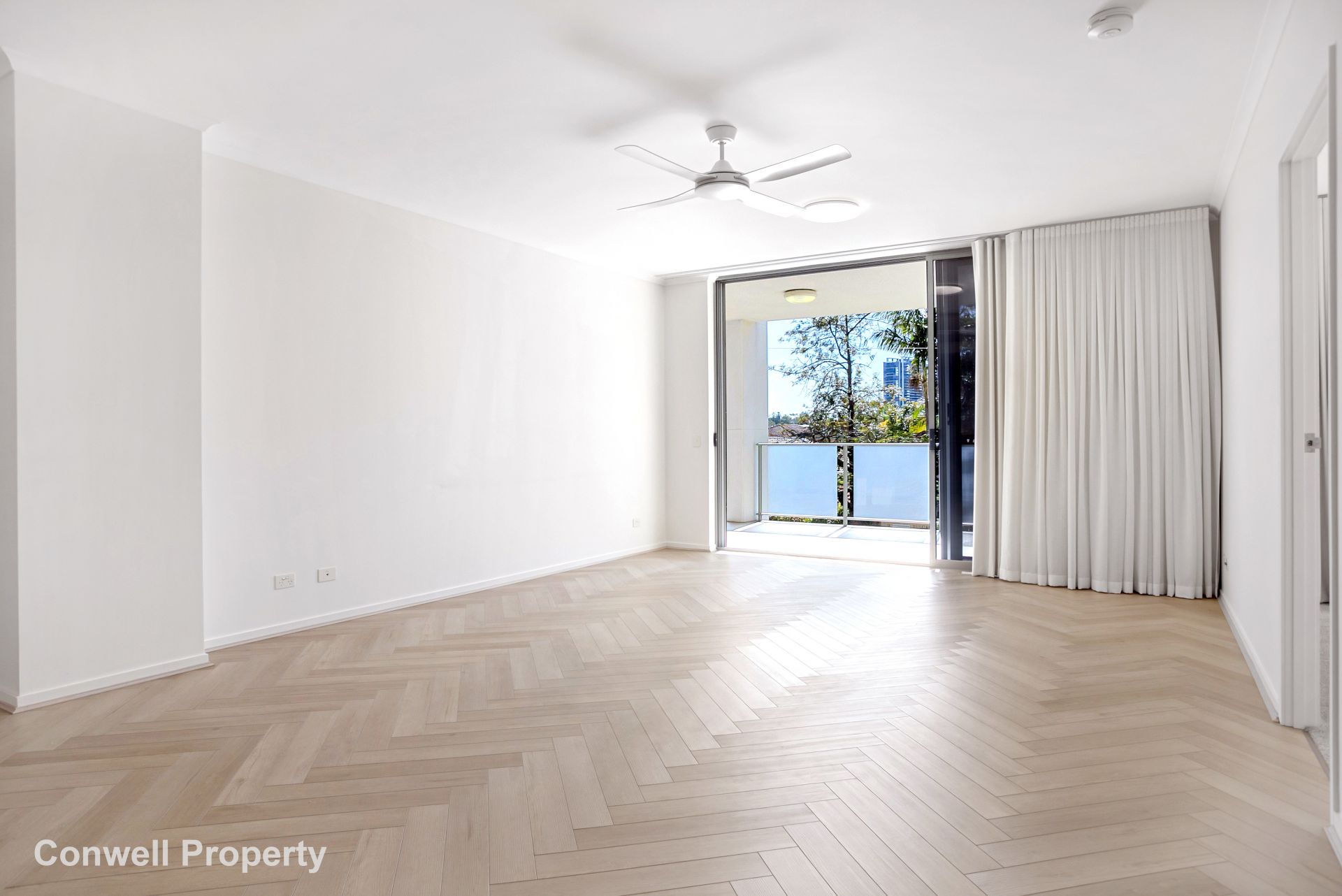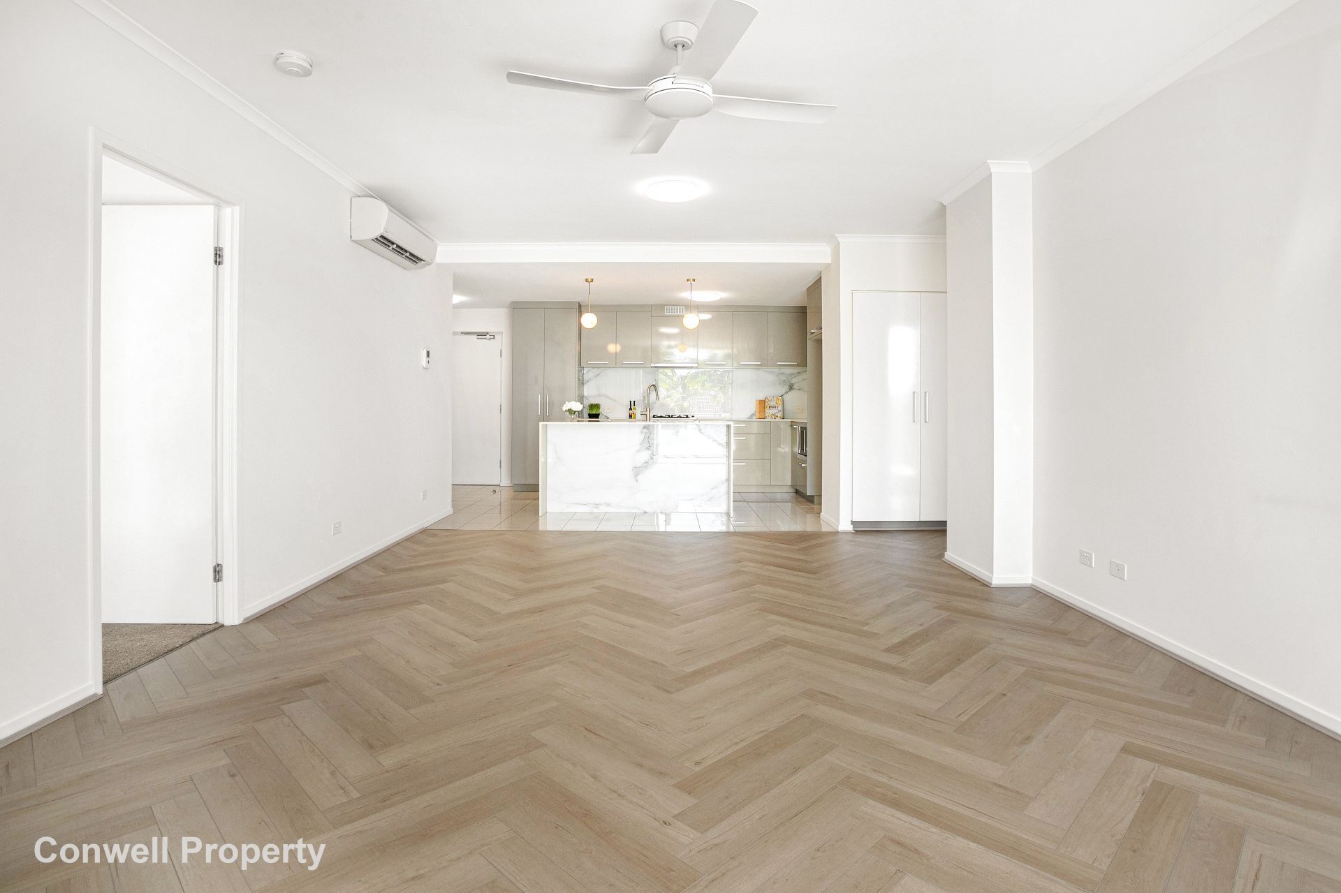 The open plan large living space, lined with gorgeous herringbone floors, allows for a separation of bedrooms – perfect for privacy and leads though full-length sliding glass doors to the 31m2 oversized covered balcony and outdoor entertaining area. What a terrific sundrenched place to relax for morning coffee or peaceful retreat after the business of the day.