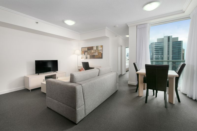 Perfect for an executive, this beautiful, high level apartment is fully furnished and spacious with a gorgeous large balcony. The bedroom features double mirrored wardrobe doors and a large window with wide city views.