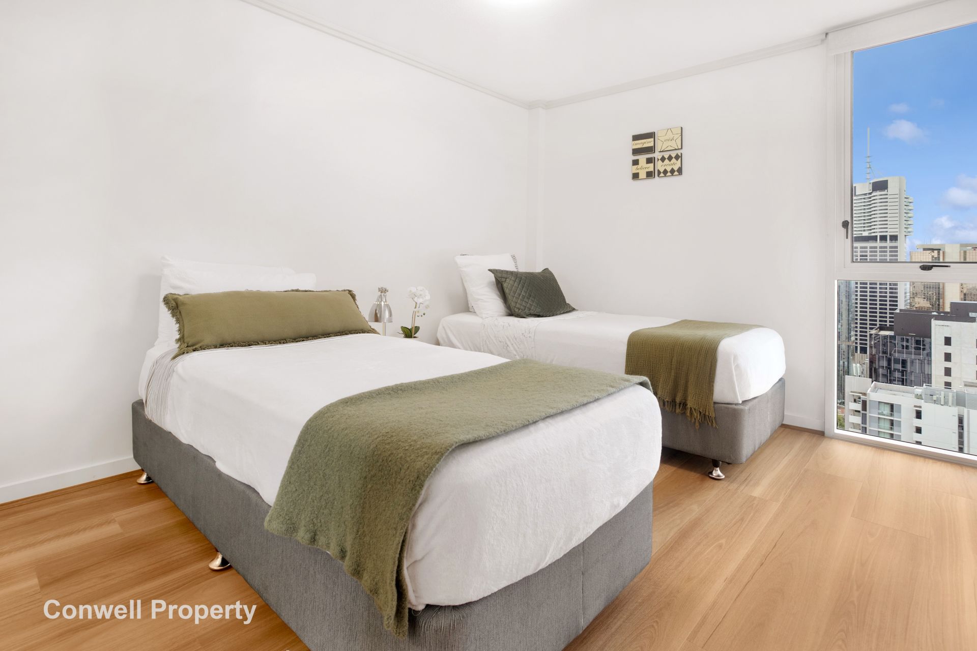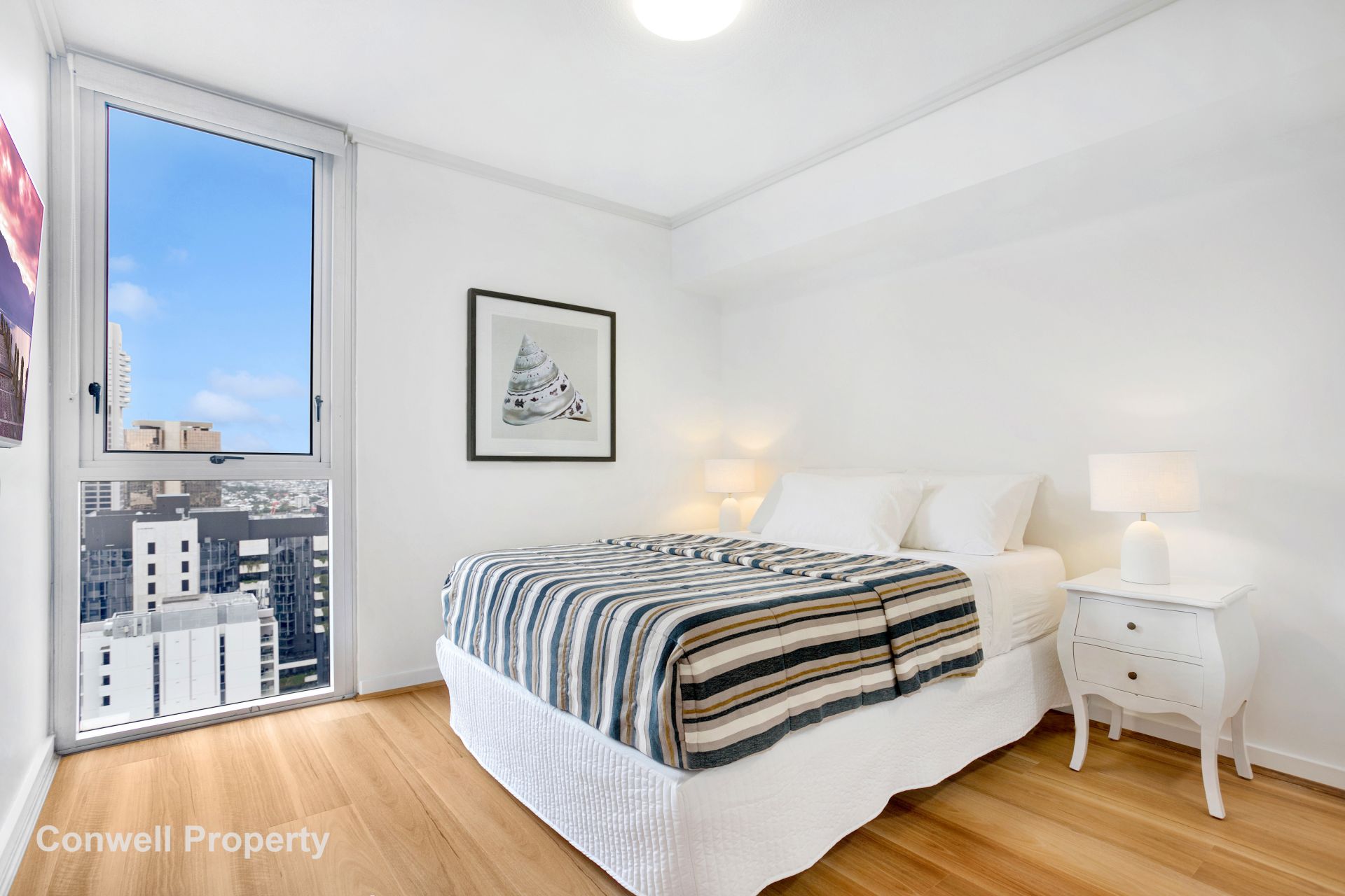 The special timber-look flooring has recently been laid throughout the whole apartment and is easy care and easy clean. near new curtains and blinds line the windows and allow you to change your atmosphere from sky high views to cosy comfort.