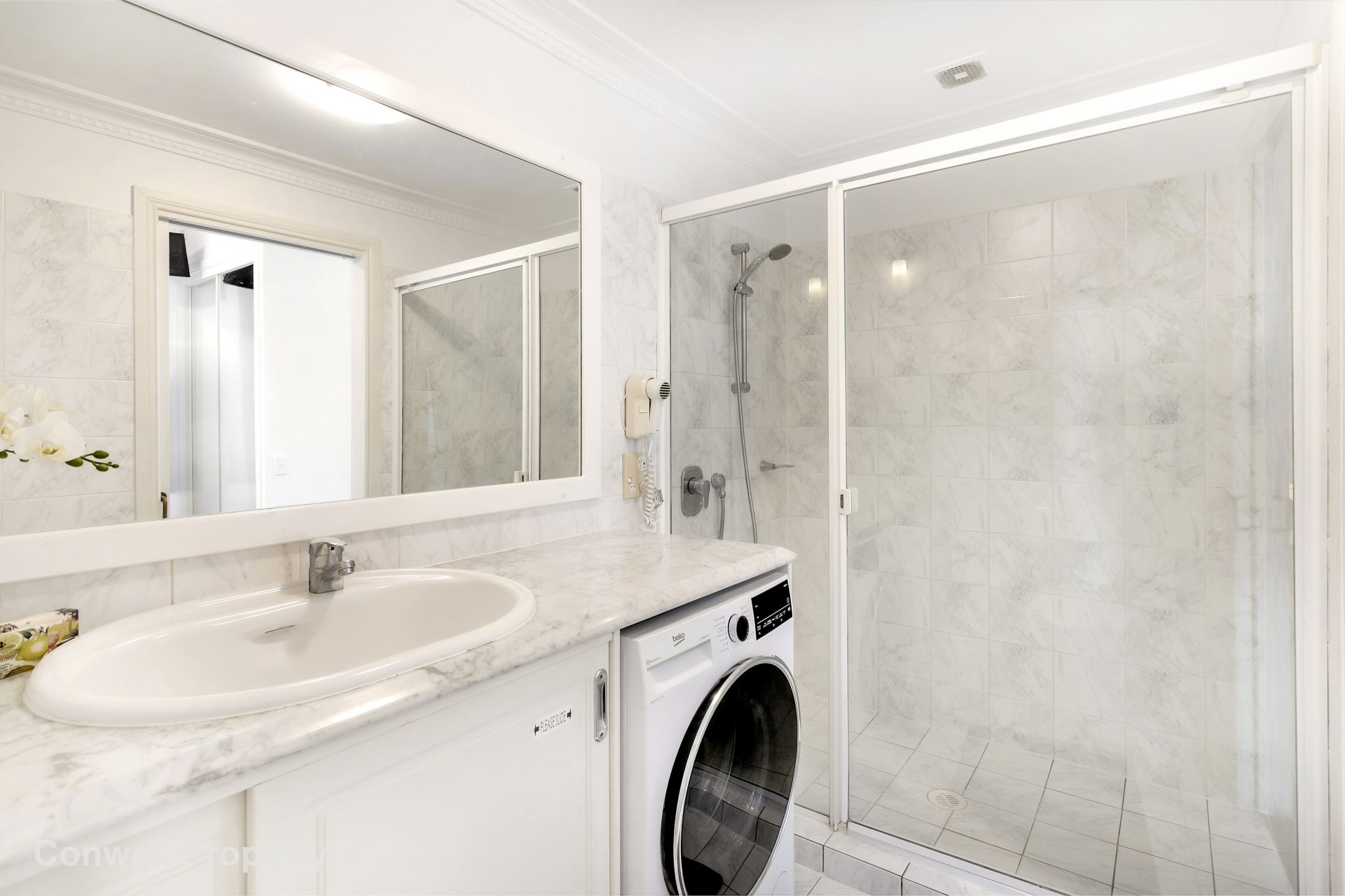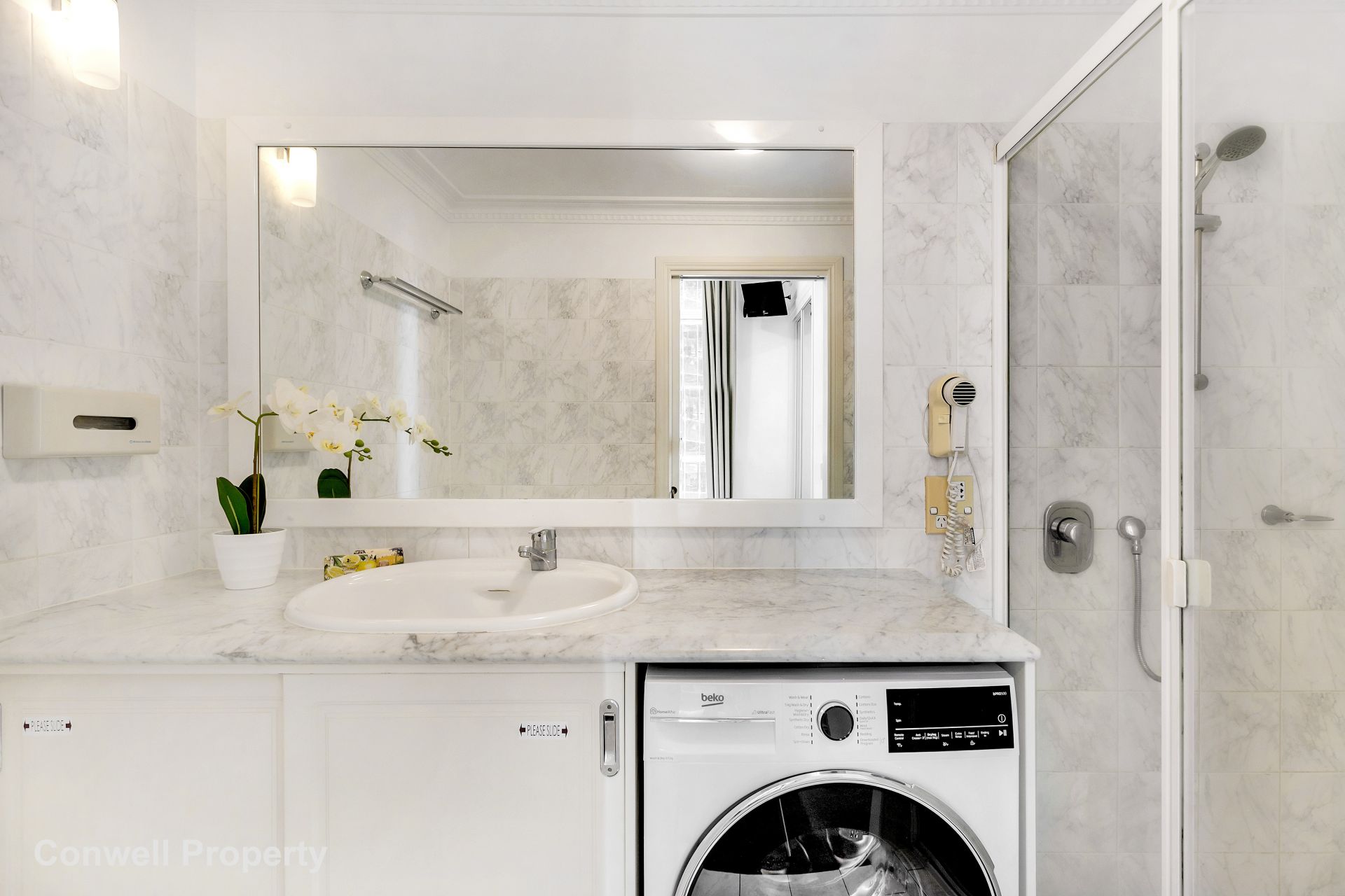 The bedroom comes complete with built-in wardrobe and access to a private Juliette balcony, while the ensuite bathroom includes an oversized shower and long marble benchtop with a HUGE basin and loads of cupboard storage.