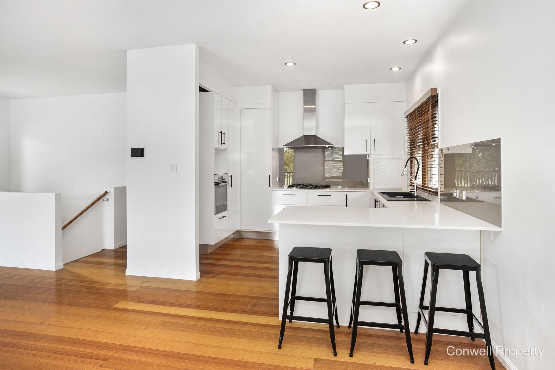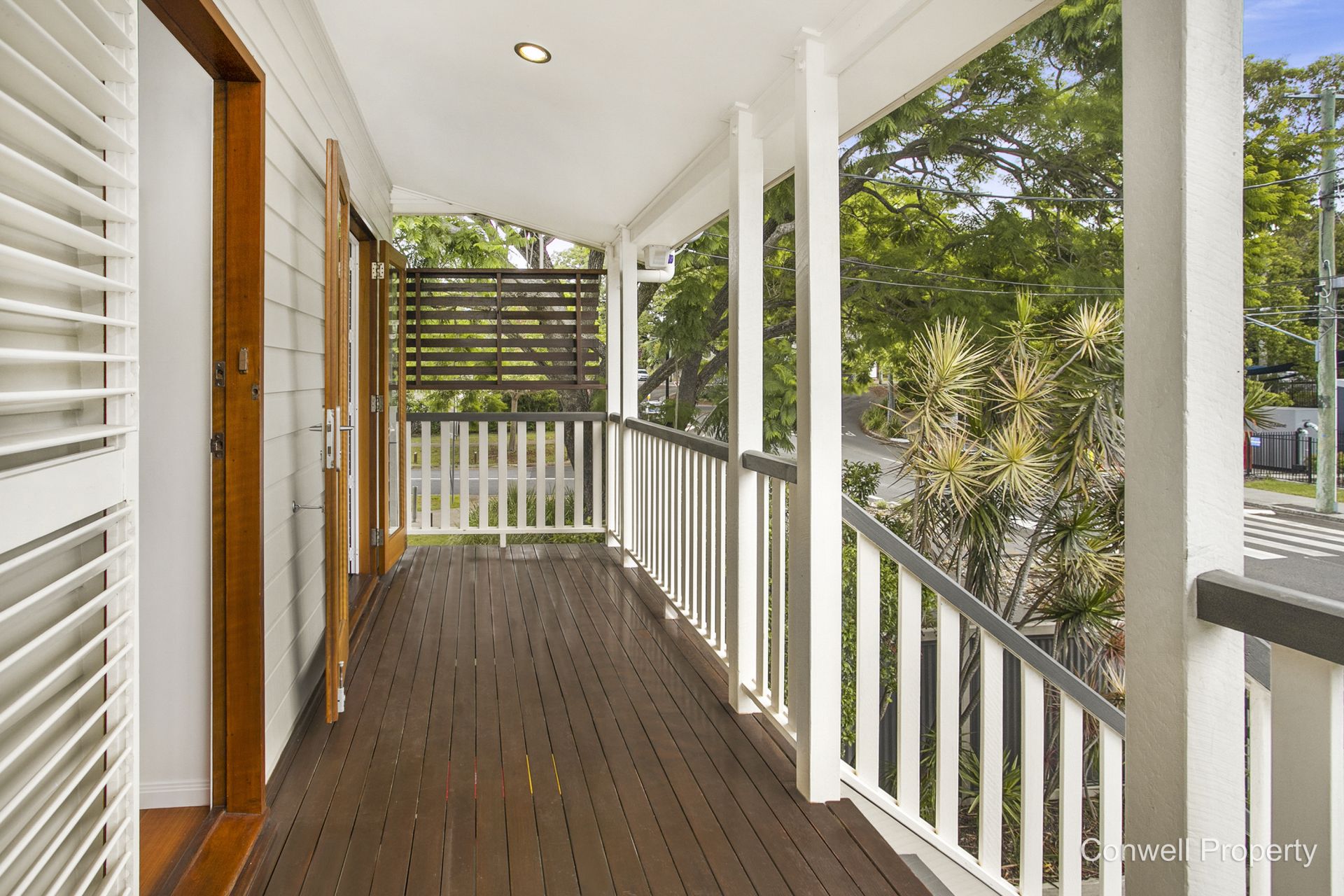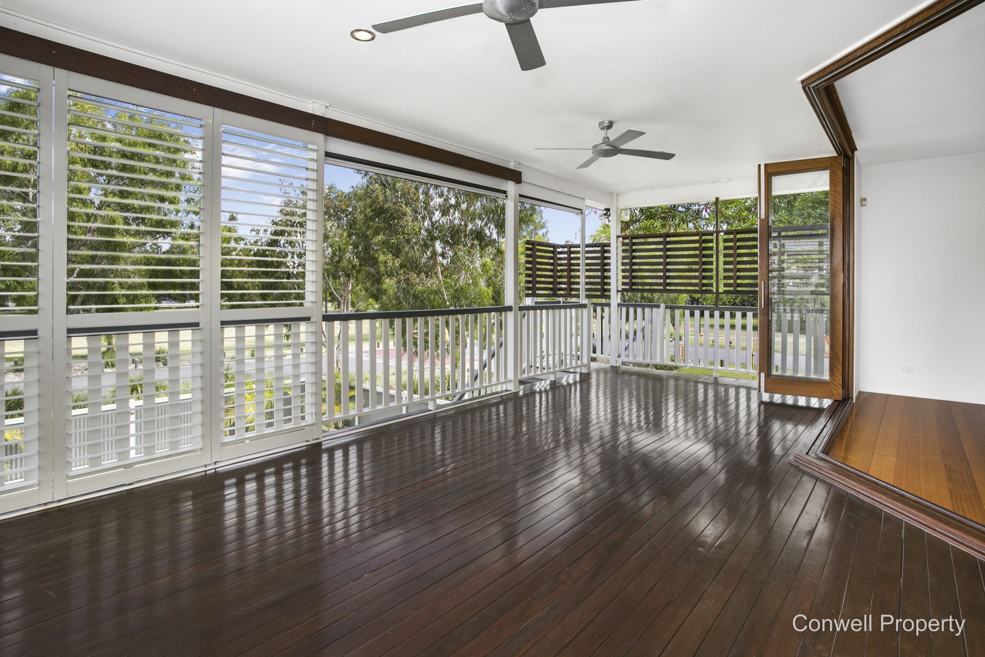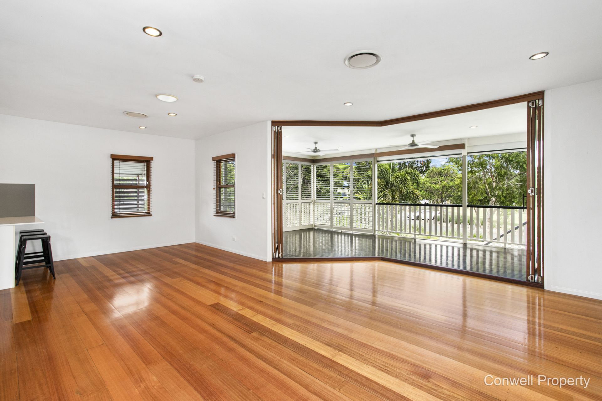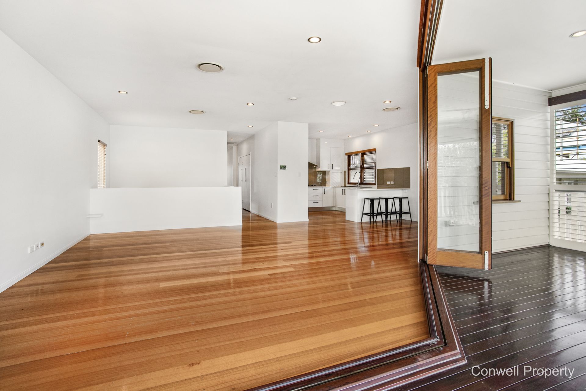 Perfectly polished floors line the upstairs hall of the home which extends past 4 bedrooms and 2 bathrooms to the open plan living/dining area and leading to the most glorious and huge, entertainers deck complete with view over the inground pool to the tree lined street and parklands beyond.