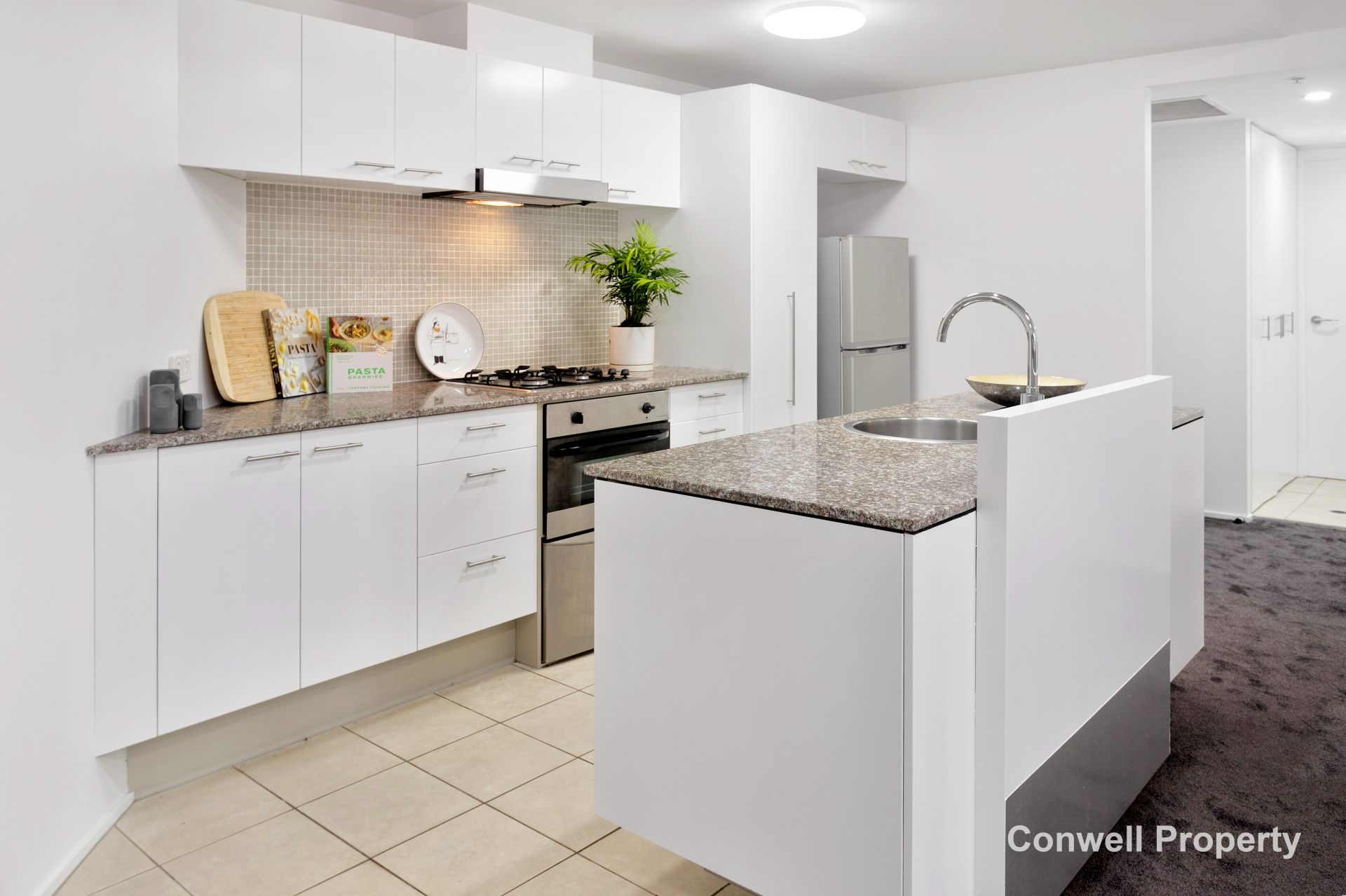 The spacious and stylish kitchen includes high quality appliances, crisp stone benchtops with gas cooking, and is positioned well in the open plan living design.
