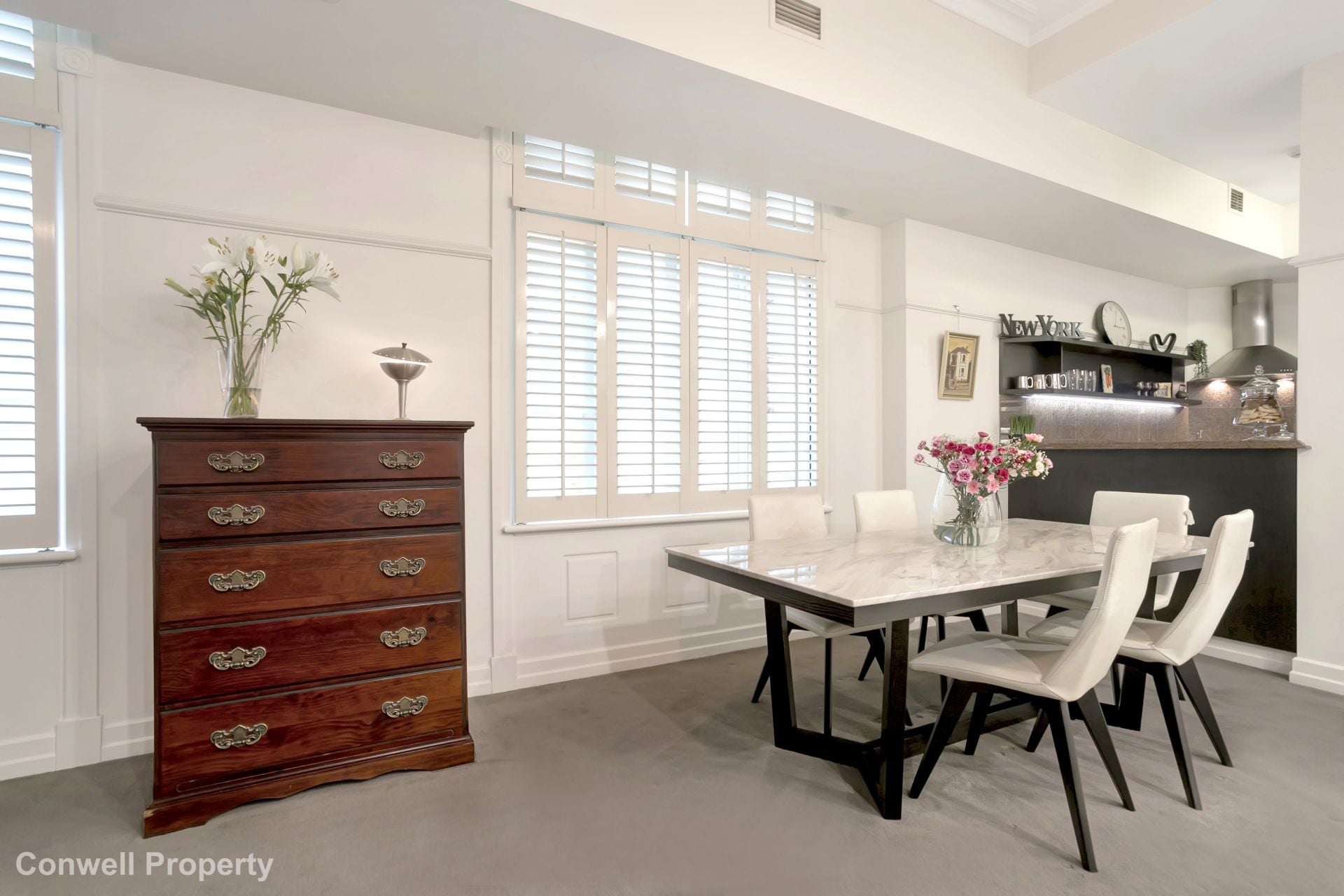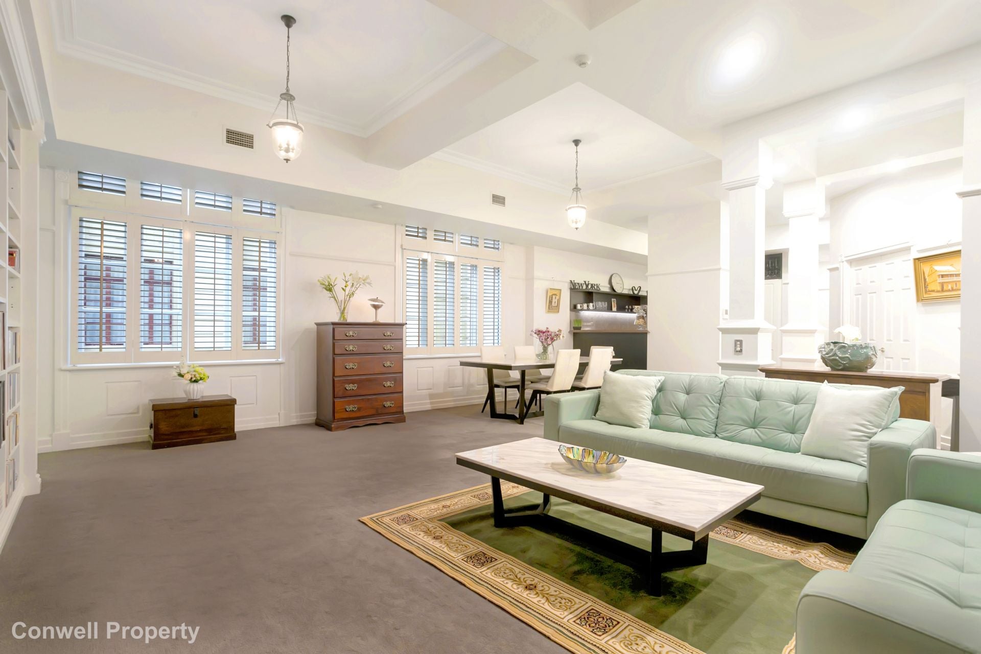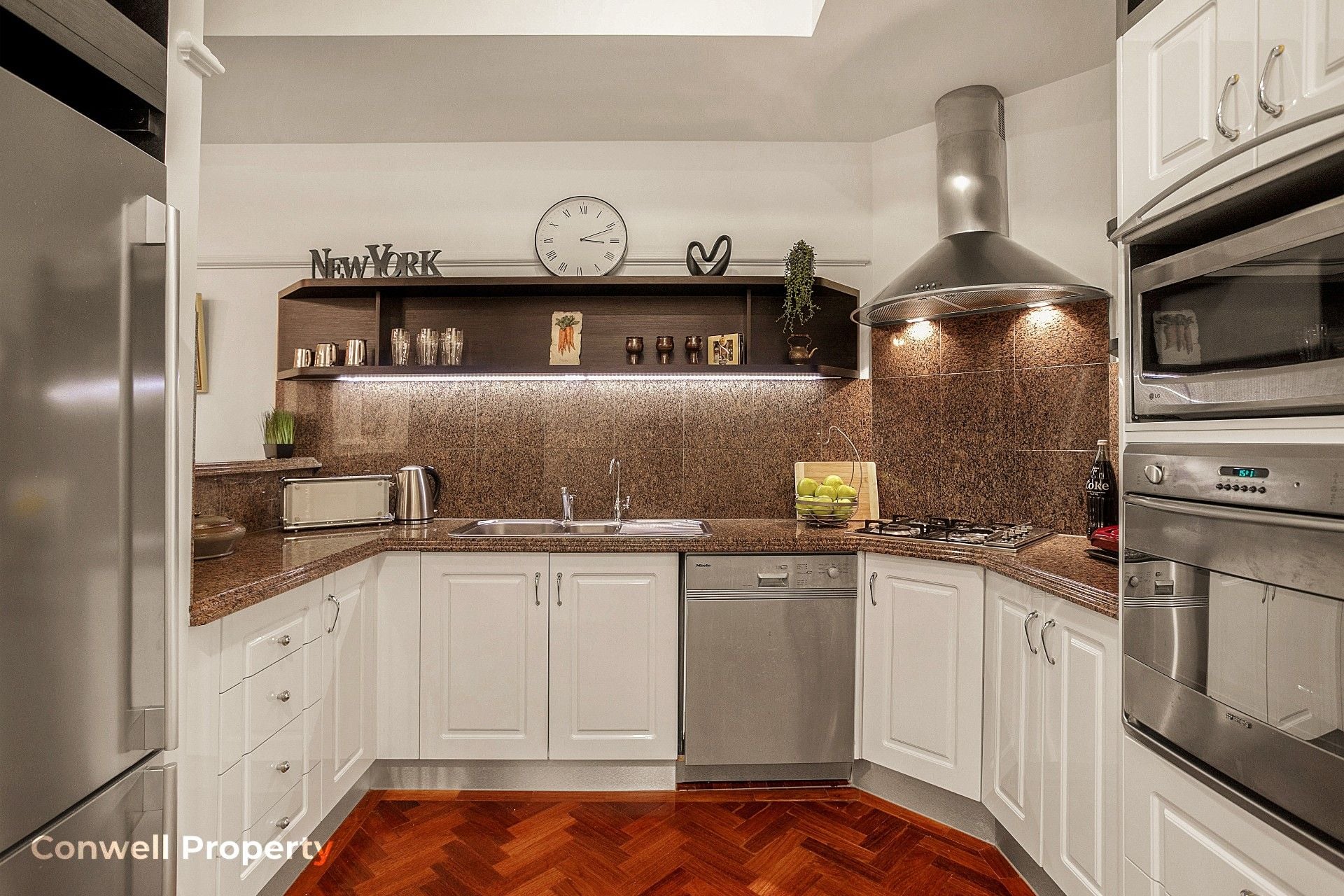 The well-planned floorplan of this 136m2 apartment, allows for a large open living area with custom-built library and a private guest wing and includes all the fine features reminiscent of a Paris or New York style apartment. The delights include high coffered ceilings, ornate cornices, luxurious marble bathrooms, granite kitchen with fine appliances and traditional art deco light fixtures – all giving this home a feeling of old-world elegance and class.