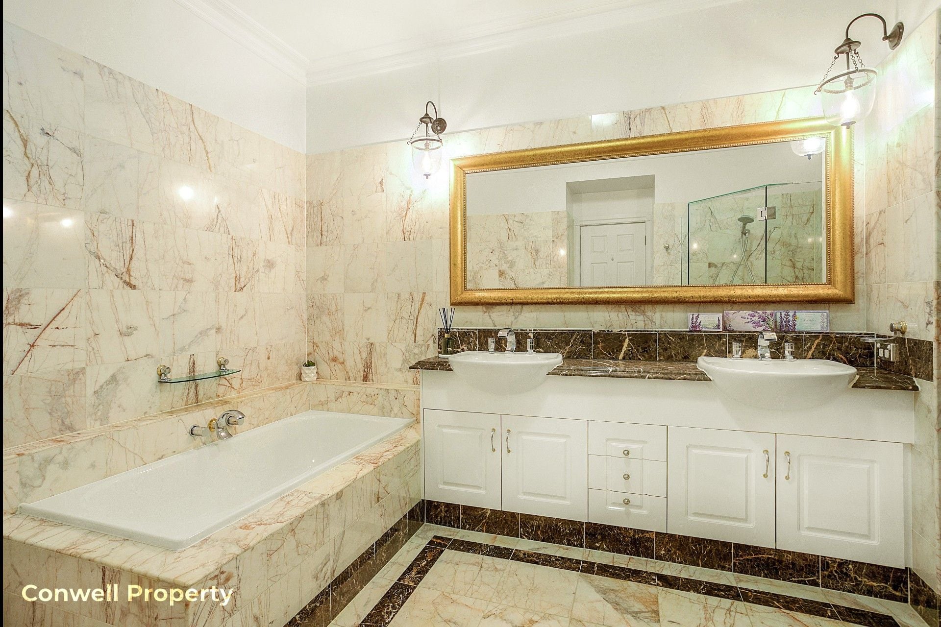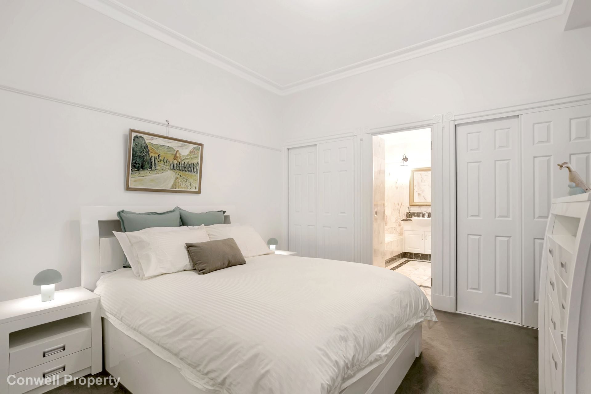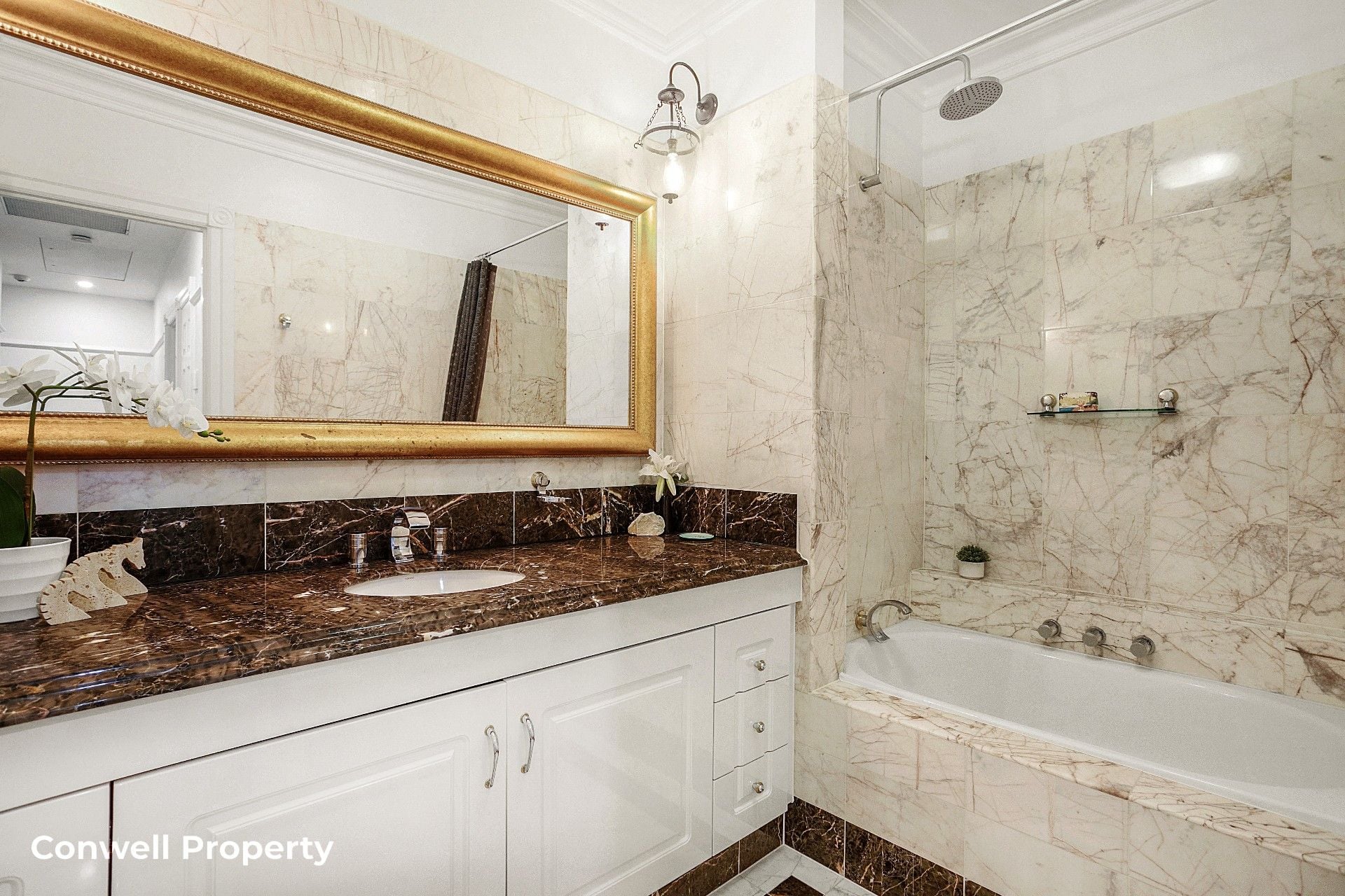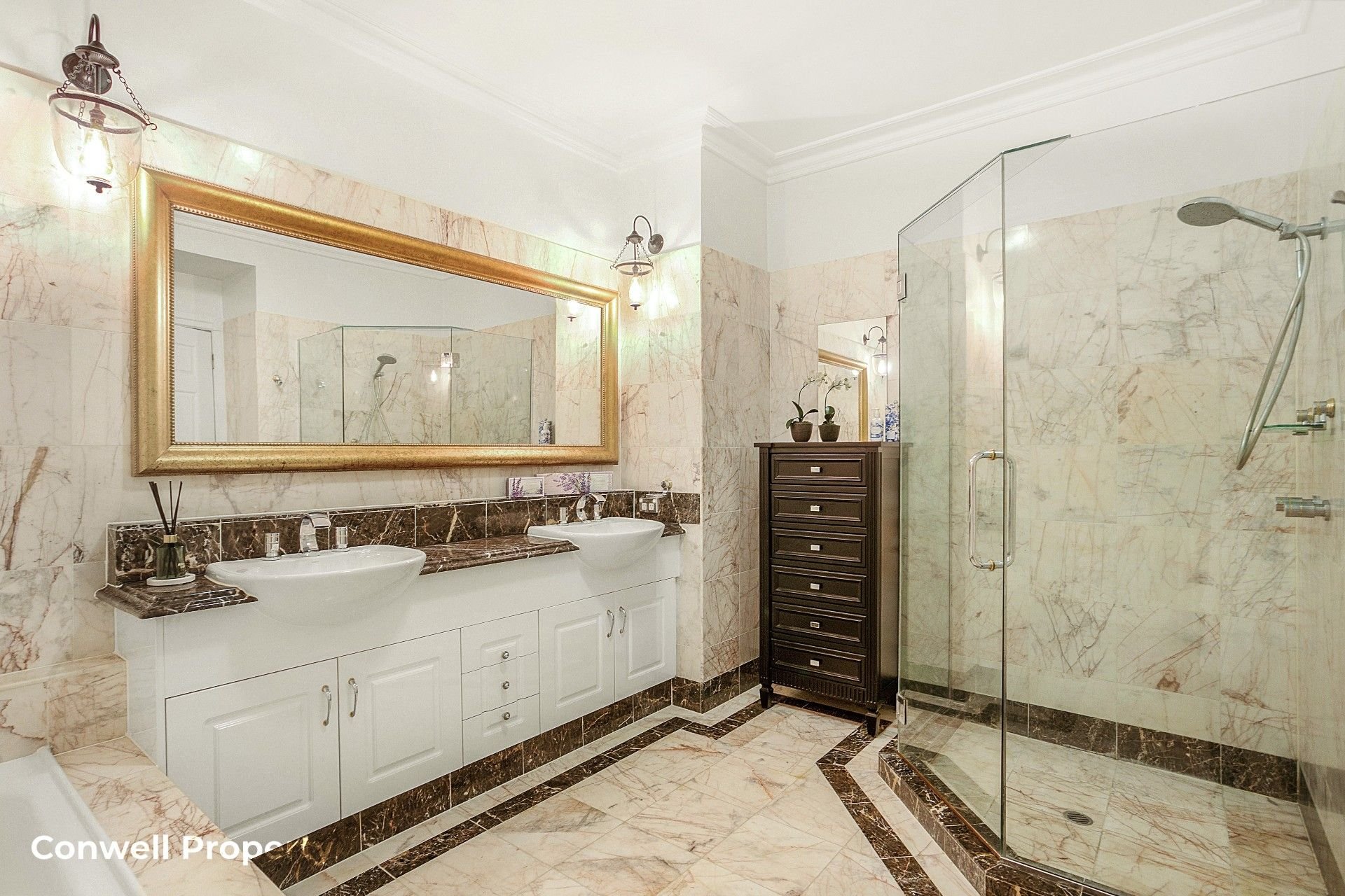 The master bedroom suite area includes an oversized marble-tiled ensuite, a luxurious deep bath and long marble benchtops with double basins and a spacious shower. The 2nd bedroom is serviced by another marble-tiled bathroom with bath, while the 3rd bedroom, accessed through double doors, is positioned perfectly to be converted to an office or media room at your pleasure.