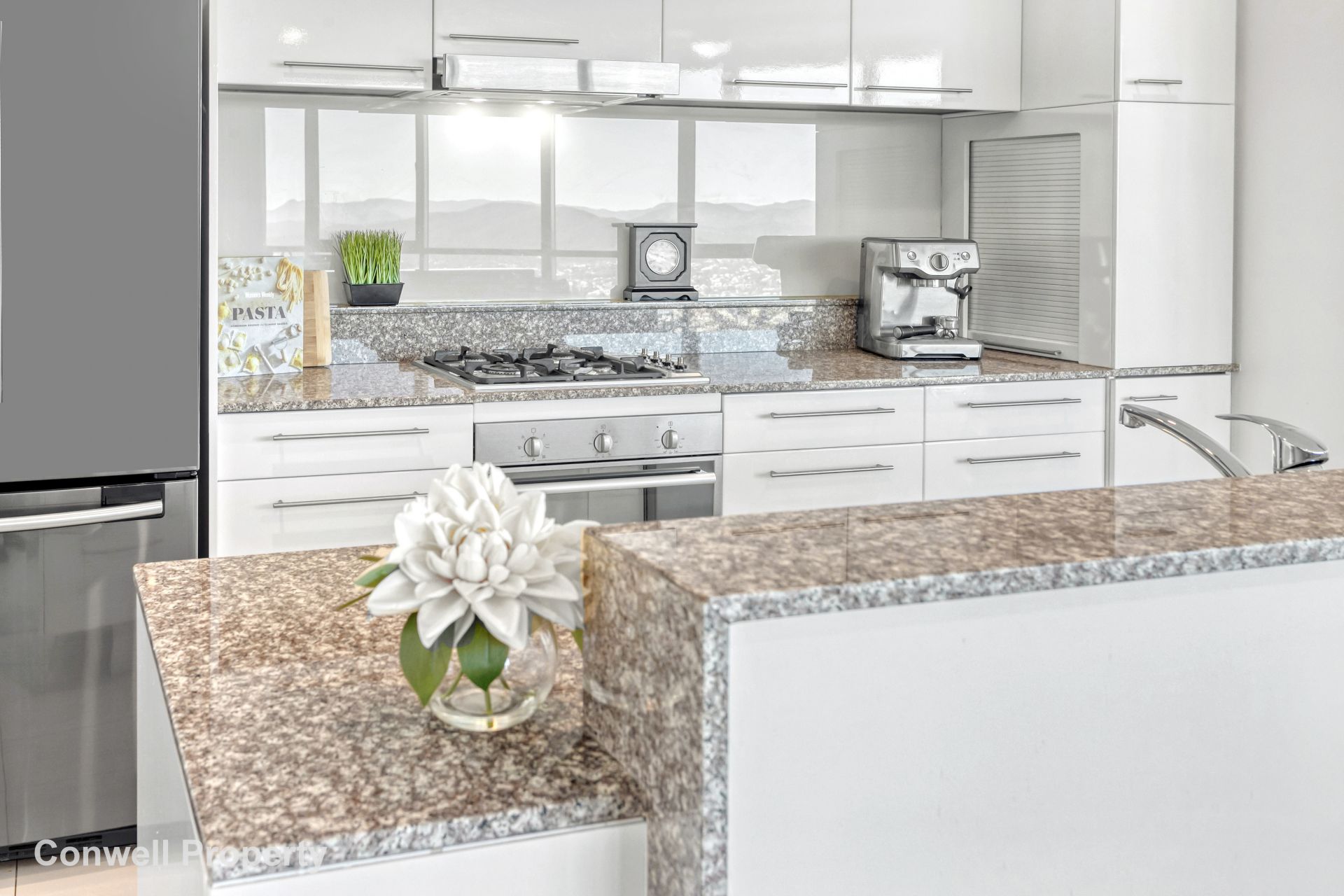The oversized open plan refurbished kitchen is a dream with gas cooking, long benchtops and even reflective glass splashbacks to capture the views from all angles!