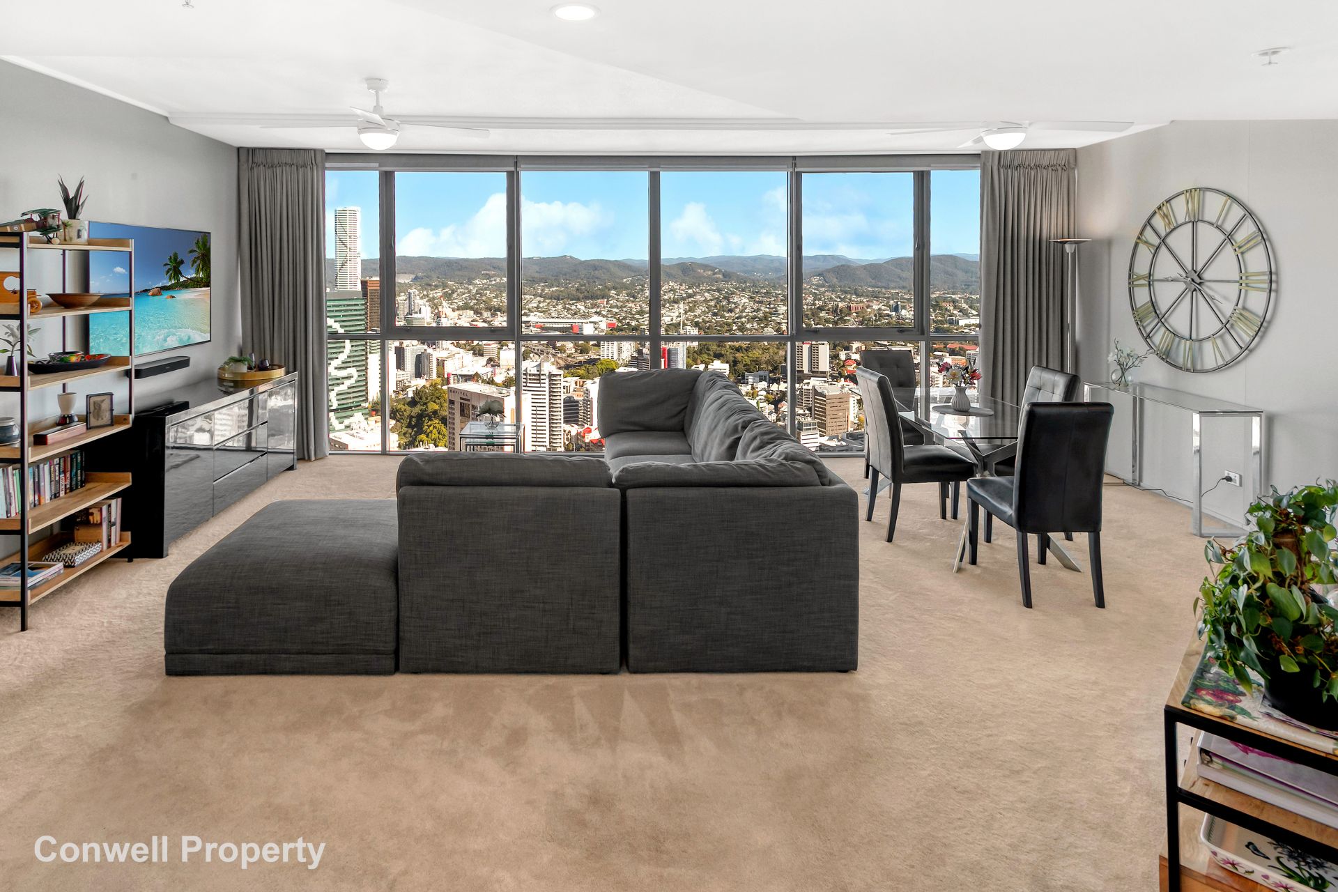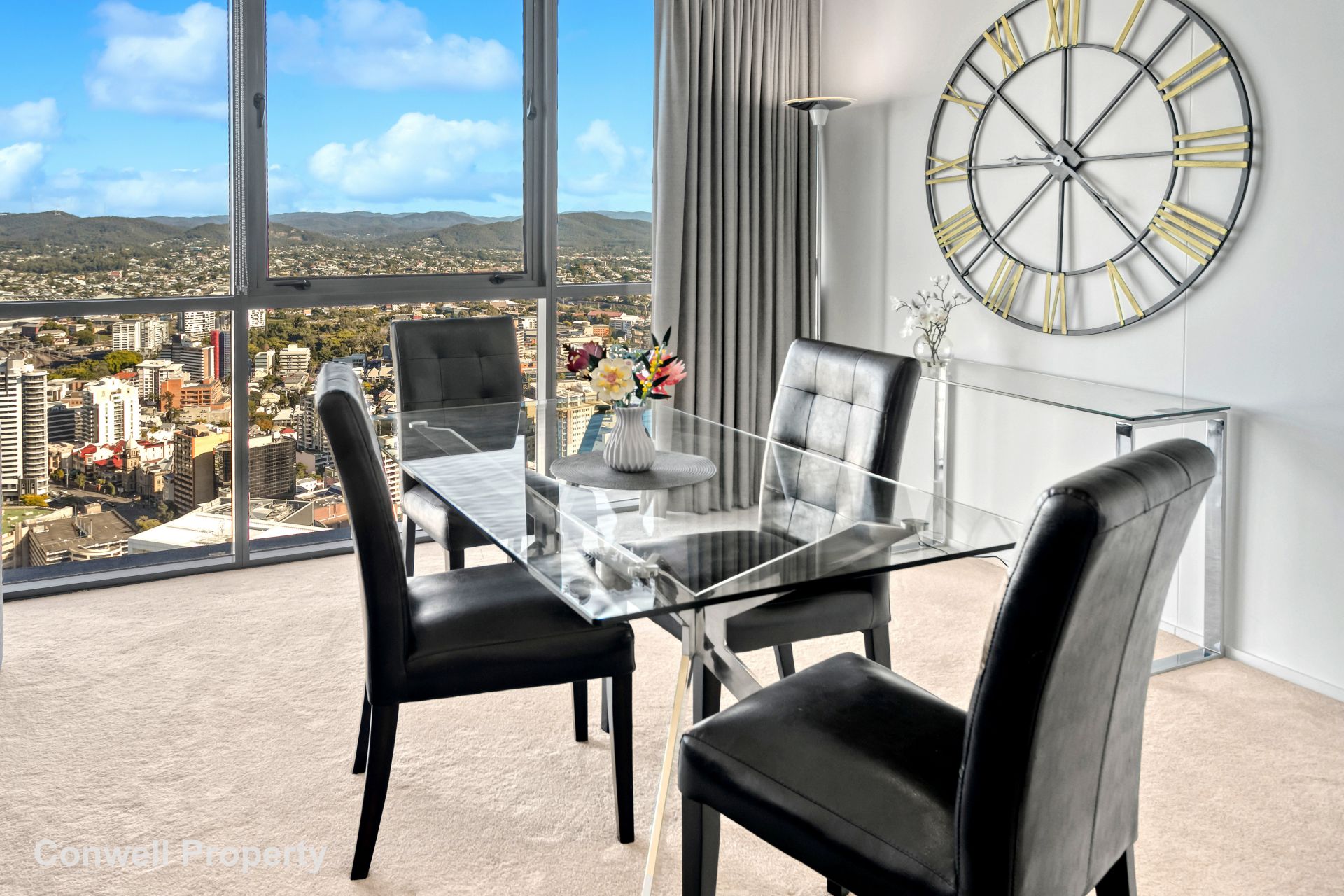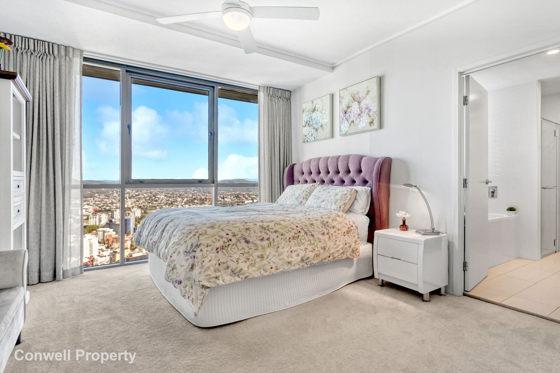 From the moment you enter this stunning and spacious home high in the sky, you are immediately mesmerised by the wide picturesque views, framed by floor to ceiling glass, which span from South Bank, past Victoria Park to the Glass House mountains in the North. At night fall, you can gaze at the fairy lights across the city or with the press of a button, the electric curtains can gently close out the world.