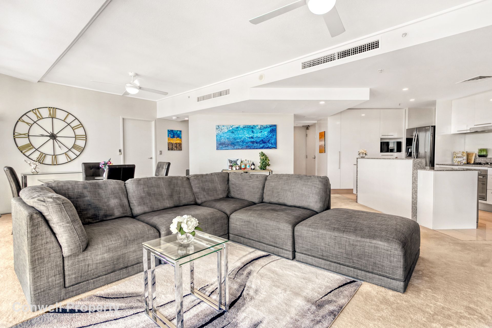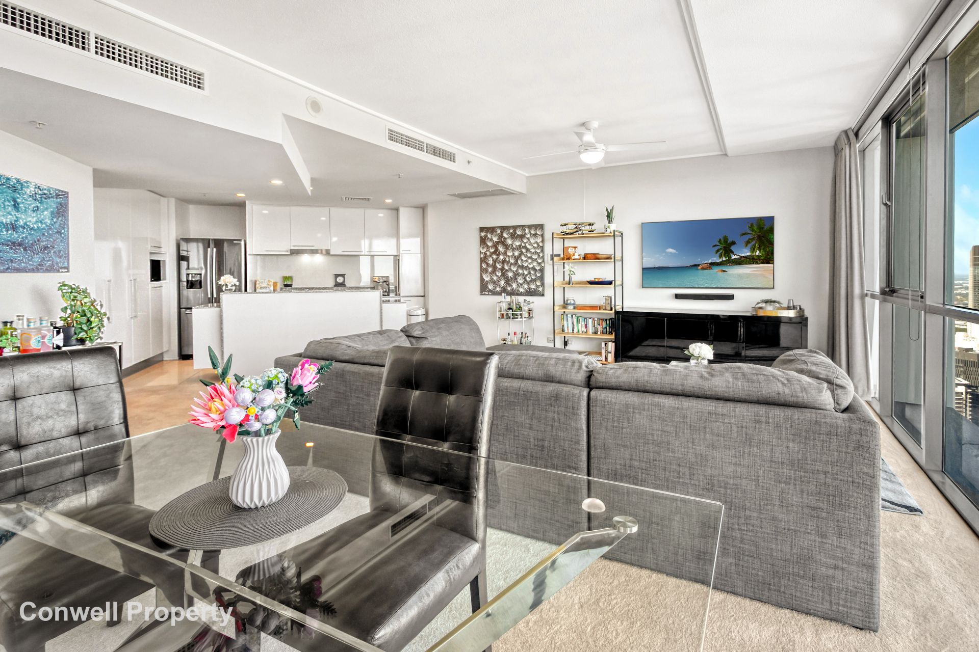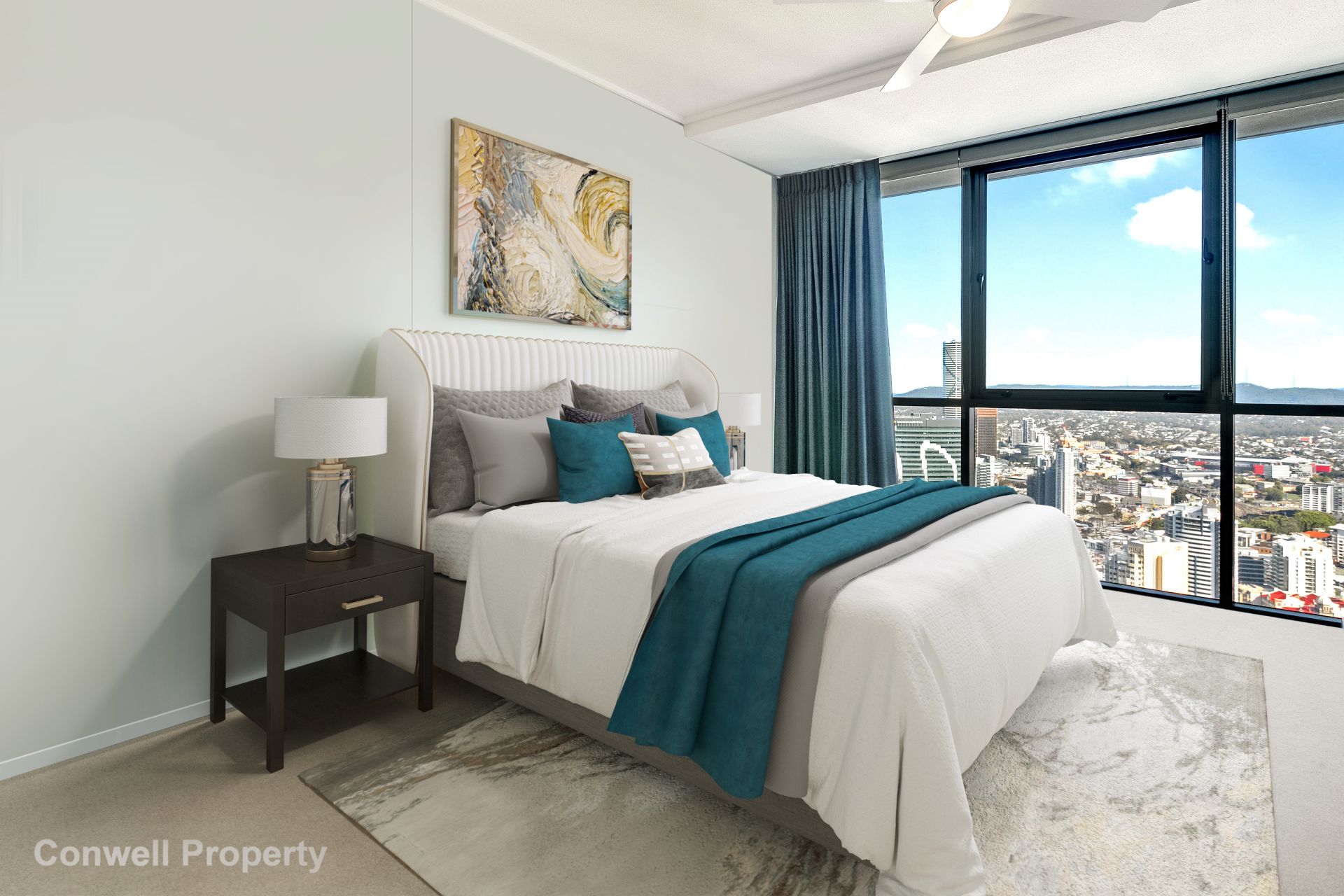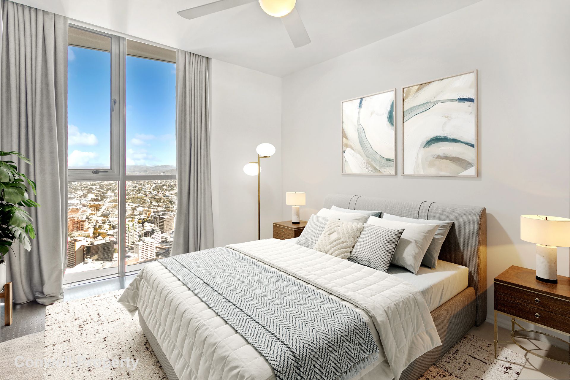 From the moment you enter this stunning and spacious home high in the sky, you are immediately mesmerised by the wide picturesque views, framed by floor to ceiling glass, which span from South Bank, past Victoria Park to the Glass House mountains in the North. At night fall, you can gaze at the fairy lights across the city or with the press of a button, the electric curtains can gently close out the world.