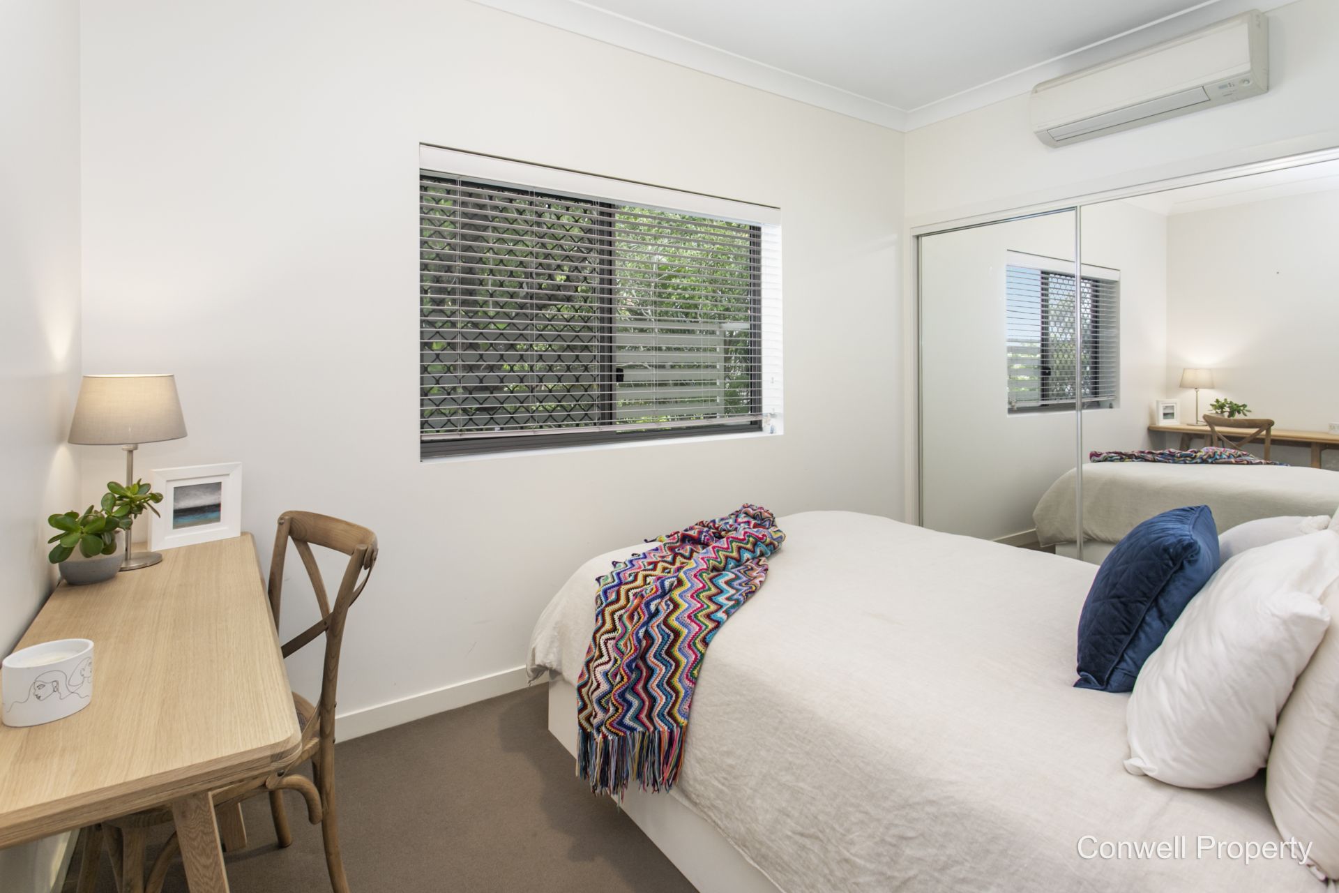 Both bedrooms have wide windows and built-in wardrobes with mirrored doors.