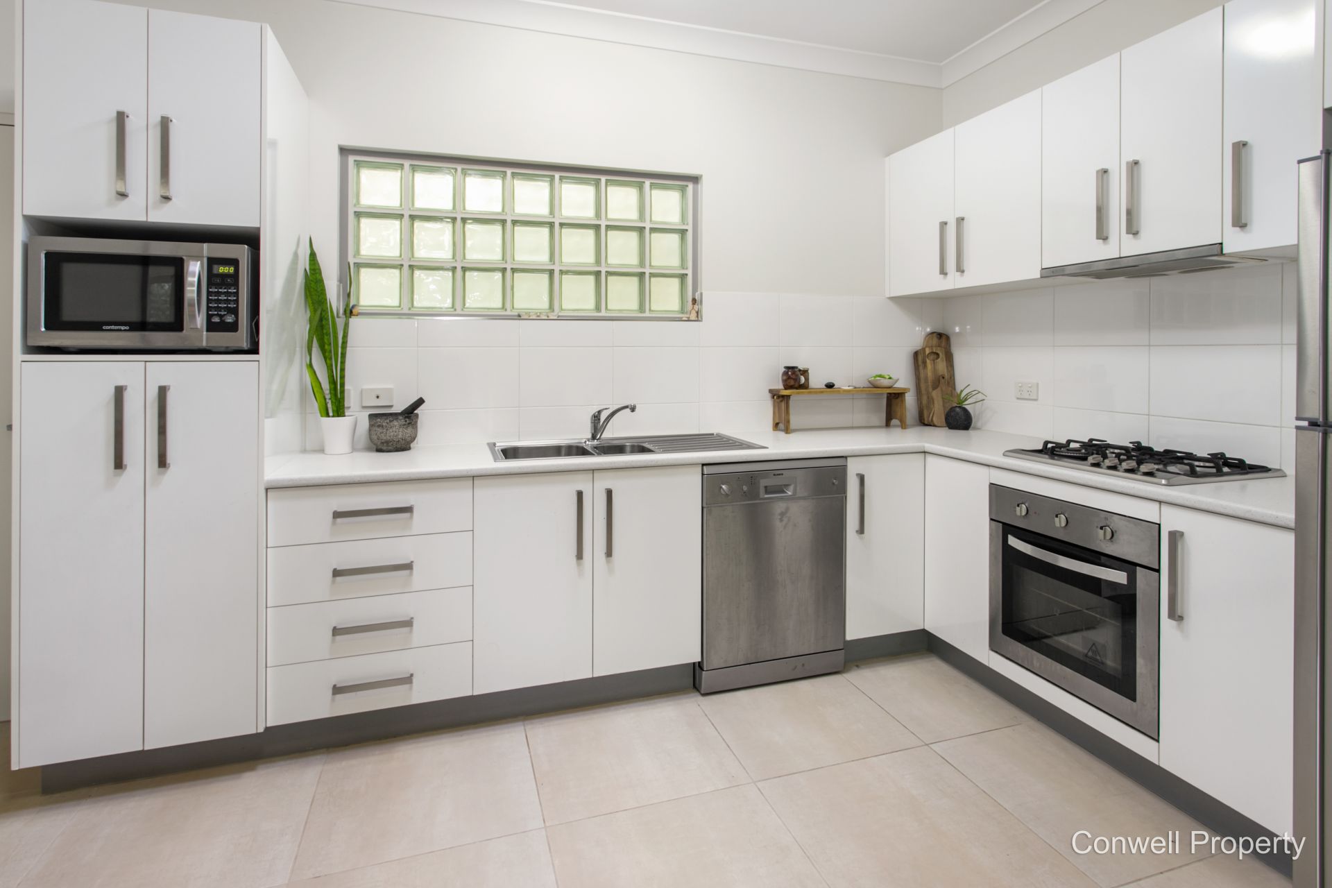 The modern kitchen has stone benchtops and quality appliances with gas hotplates, dishwasher and plenty of cupboards and is open to the living area which enhances the modern feel of convenience.