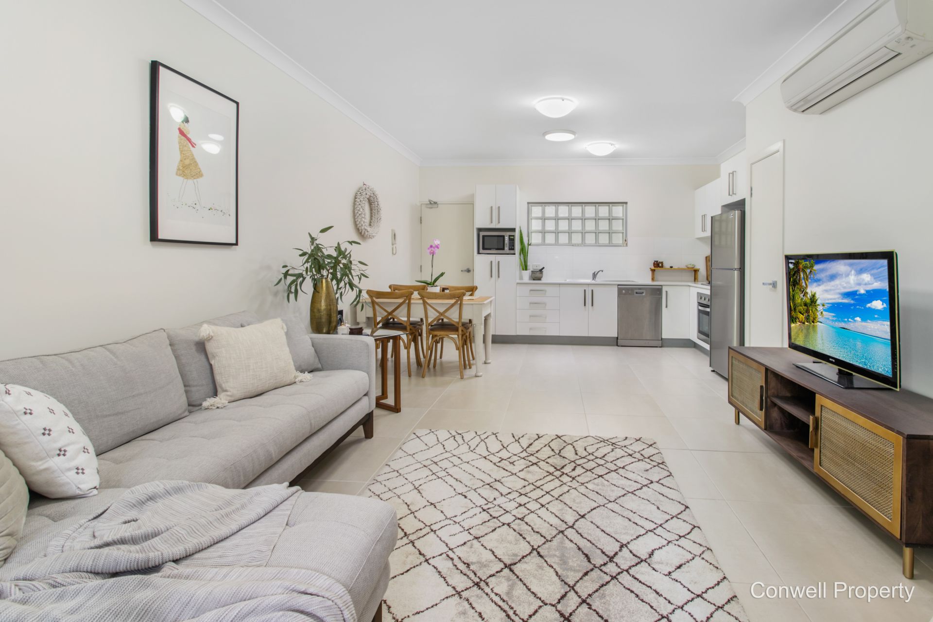 Stylish and spacious in design, the generous open plan living area leads direct to the covered balcony which includes a clothesline for your easy clothes drying.
